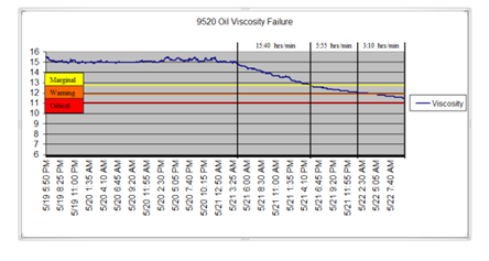 隨著原油粘度下降從正常到邊緣(約13 cP)在一段15小時40分鐘,工程師希望他能夠到達下維修設施。在接下來的8個小時,粘度中掉落的警告狀況(12 cP),對關鍵(11 cP)。它到達及時維修設施。調換火車頭,火車可能繼續其計劃。驗證了引擎故障,并進行了改革,具有顯著的節省公司。